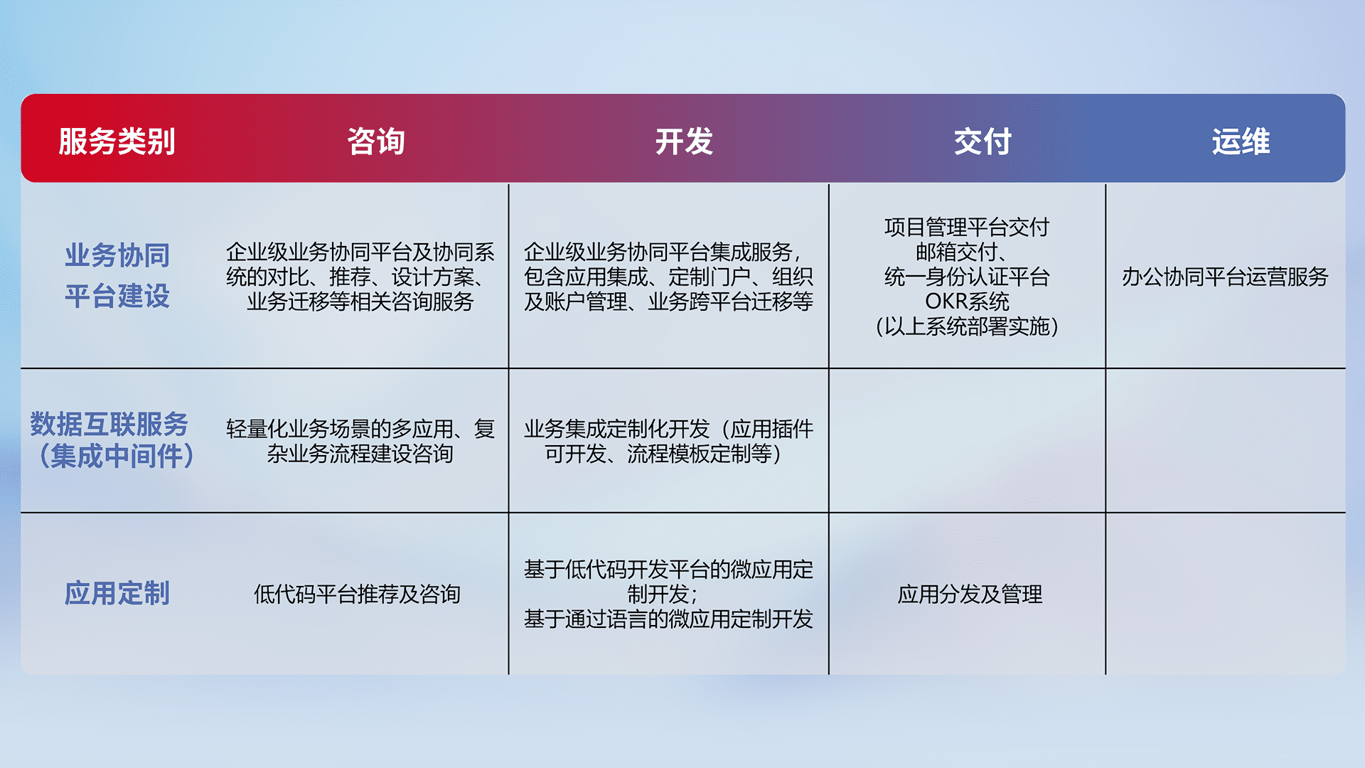 针对钉钉、、、企微、、、、IDaas等平台级产品提供产品的规划、、、、方案、、交付、、定制化开发等服务,,,,实现如统一协同办公、、智能客户服务、、混合会议管理、、、、智能数据查询、、、、等业务场景,,实现数字化转型。。。。